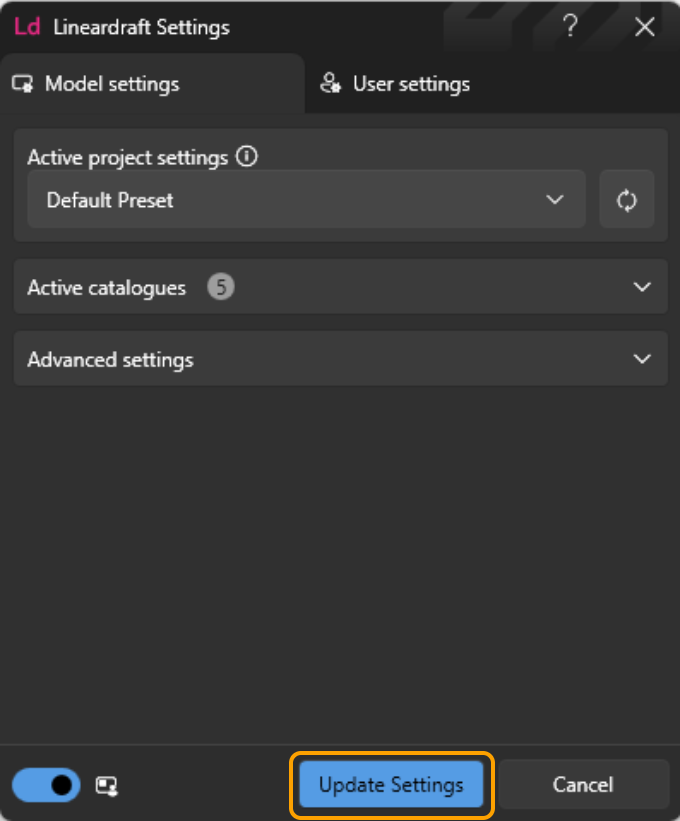 Please note: Changing your active project settings will rebuild your entire model which may take time.