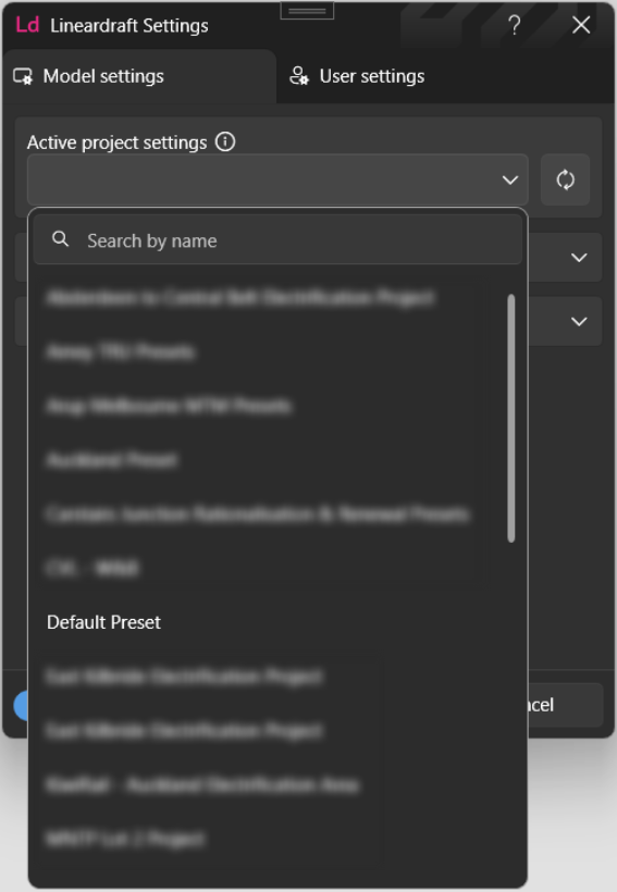 Select project settings from the drop-down for the design you are currently working on. Use the sync button to synchronise your list if you have recently updated or downloaded new project settings in your Lineardraft Desktop.